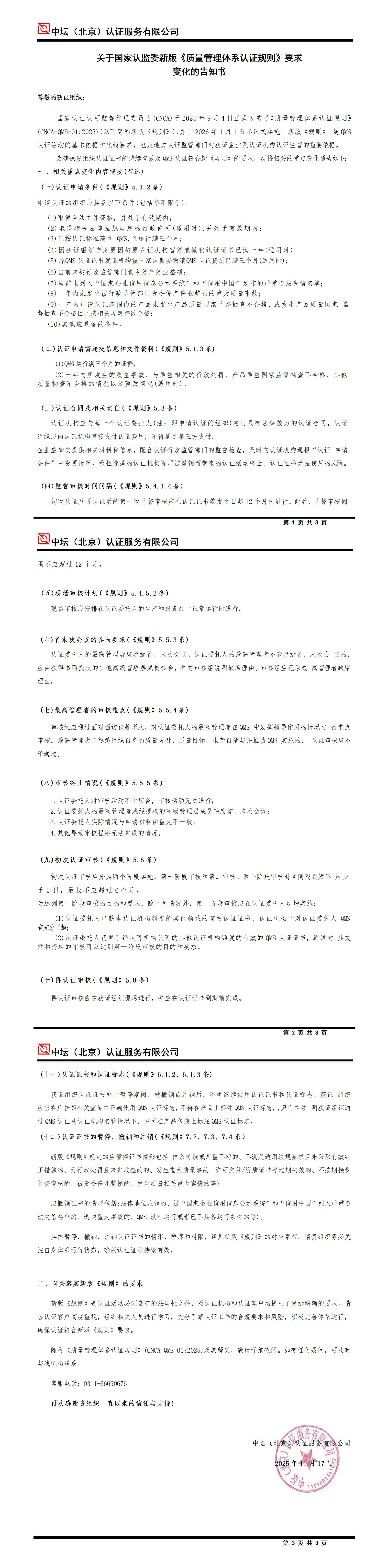 关于国家认监委新版《质量管理体系认证规则》要求变化的告知书